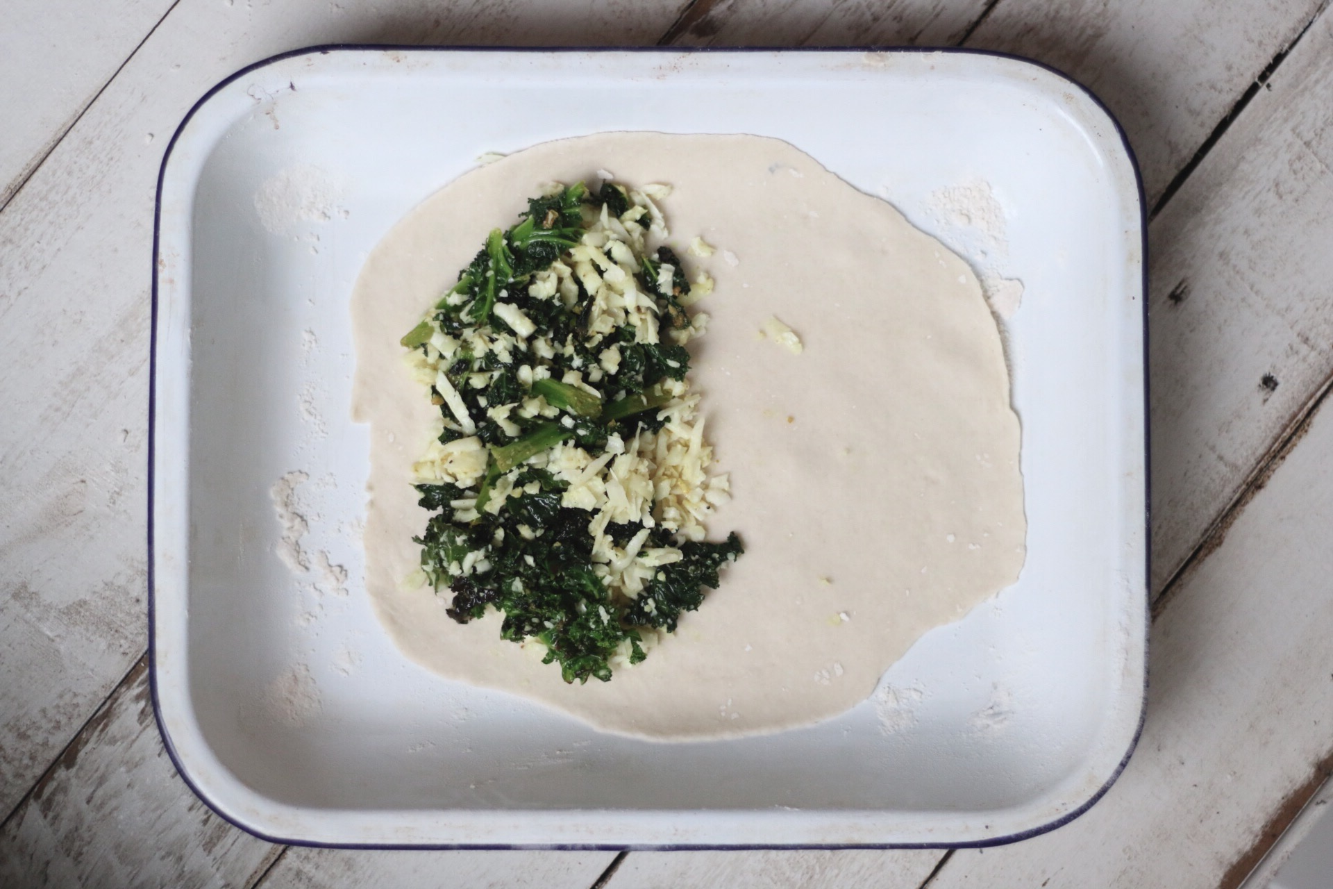 Use this dough as a base for any number of fillings. Let your imagination run wild! Melty cheeses with a green leafy veg work very well, as does pan-fried mushrooms with a fresh soft cheese like ricotta or chevre. For something more meaty, you could replace the kale with minced beef. If you’re after a hearty dessert, fill with nutella and banana, or sautéed apples with salted caramel. Go forth and enjoy!