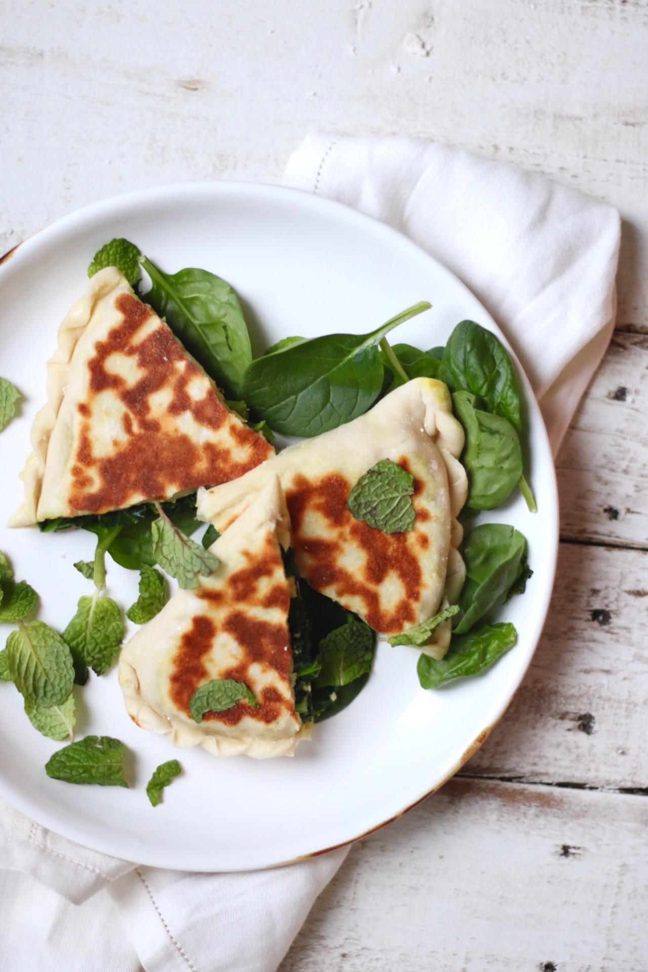 This week’s recipe is one I have shared with family, friends and neighbors for many years. This gozleme recipe is made with an extremely simple yoghurt dough. My favorite way to cook it is on the barbecue, but I’ve also made it in a sandwich press, on a stove-top griddle, or just in a fry pan. My filling is haloumi (just because, right?), and a spiced up kale, but you can really go crazy experimenting with different flavors. I’ve crimped the edges in a fairly fancy fashion (in the style of the Chinese dumplings I used to make with my mother) but you can simply fold them over and seal with the edge of a fork.