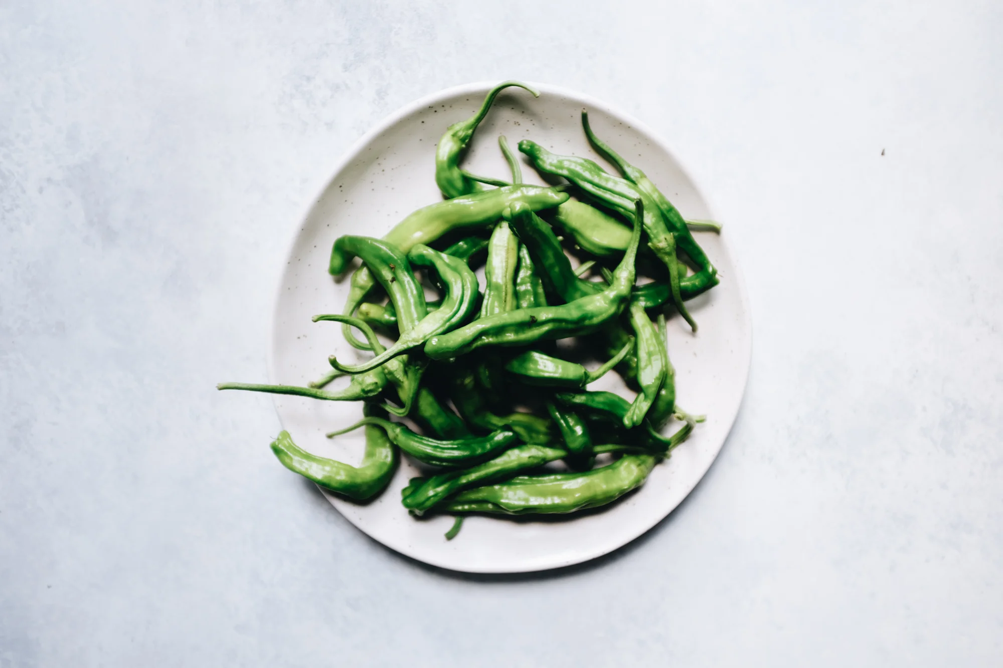 Place a large skillet on high heat, add a drizzle of oil and add the shishito peppers. Cook on high heat, shaking the skillet often to move the peppers around, until blistered. Remove and place onto