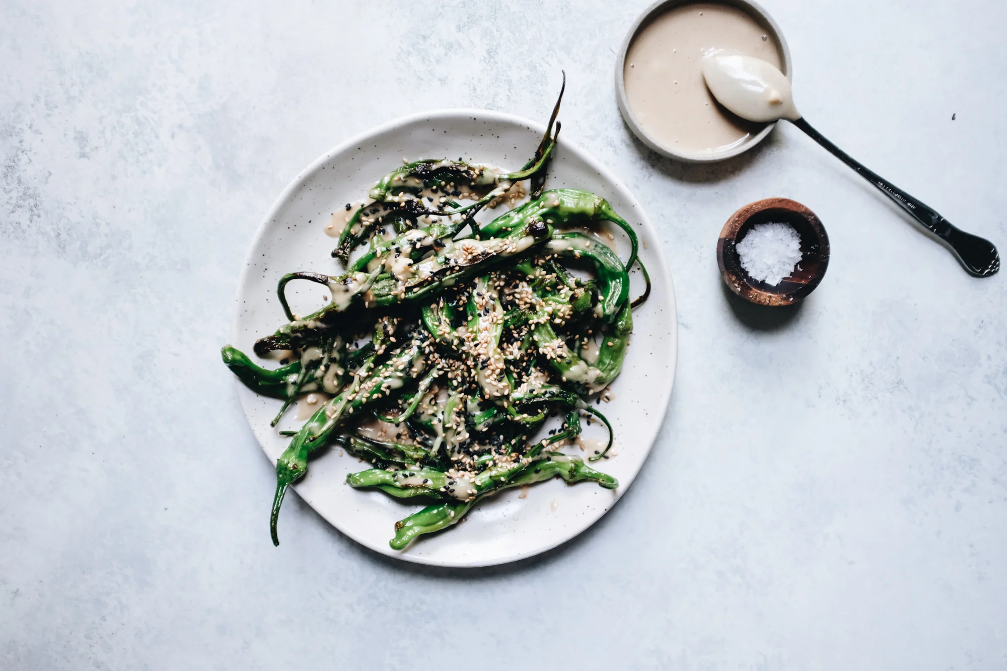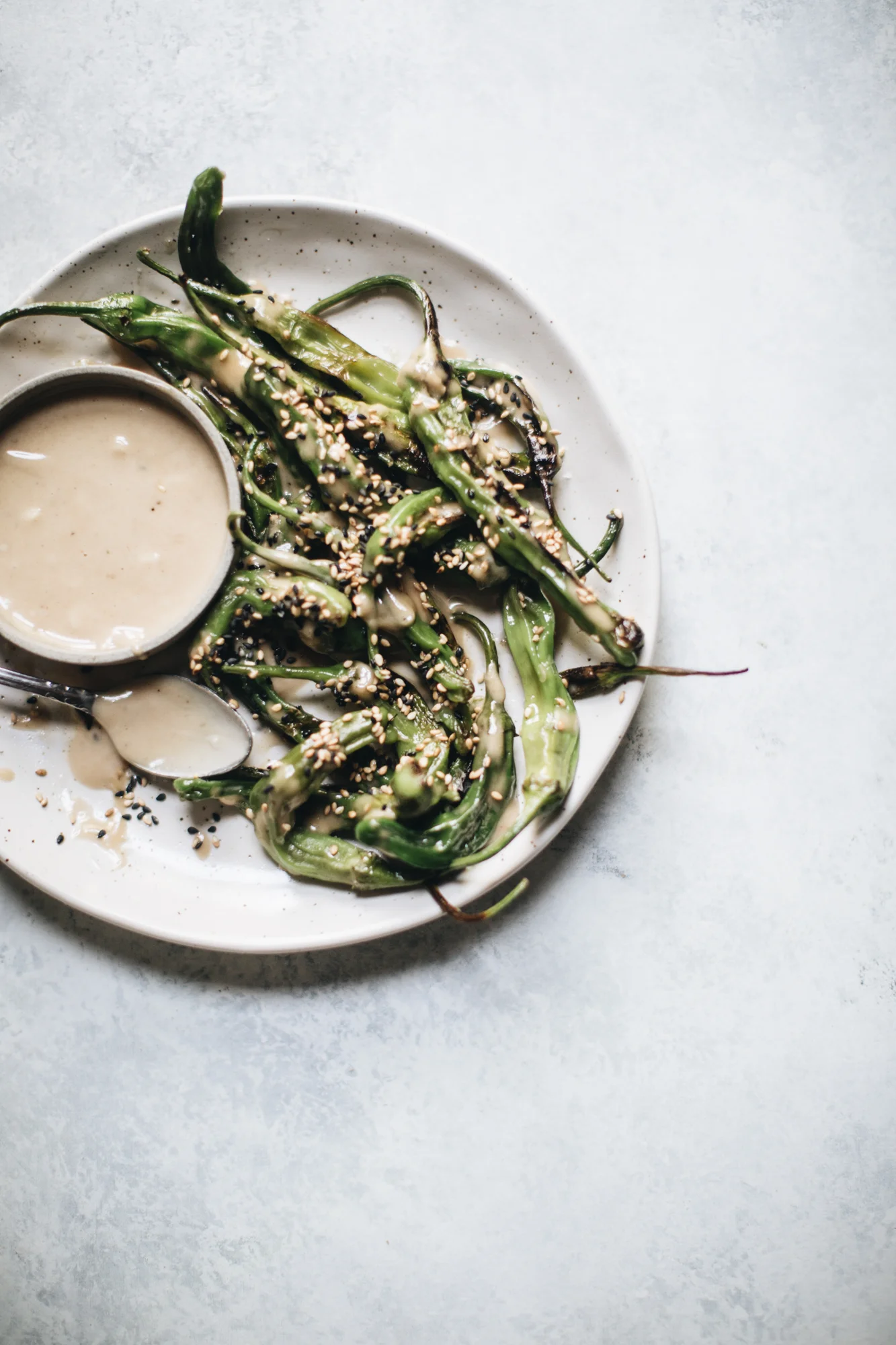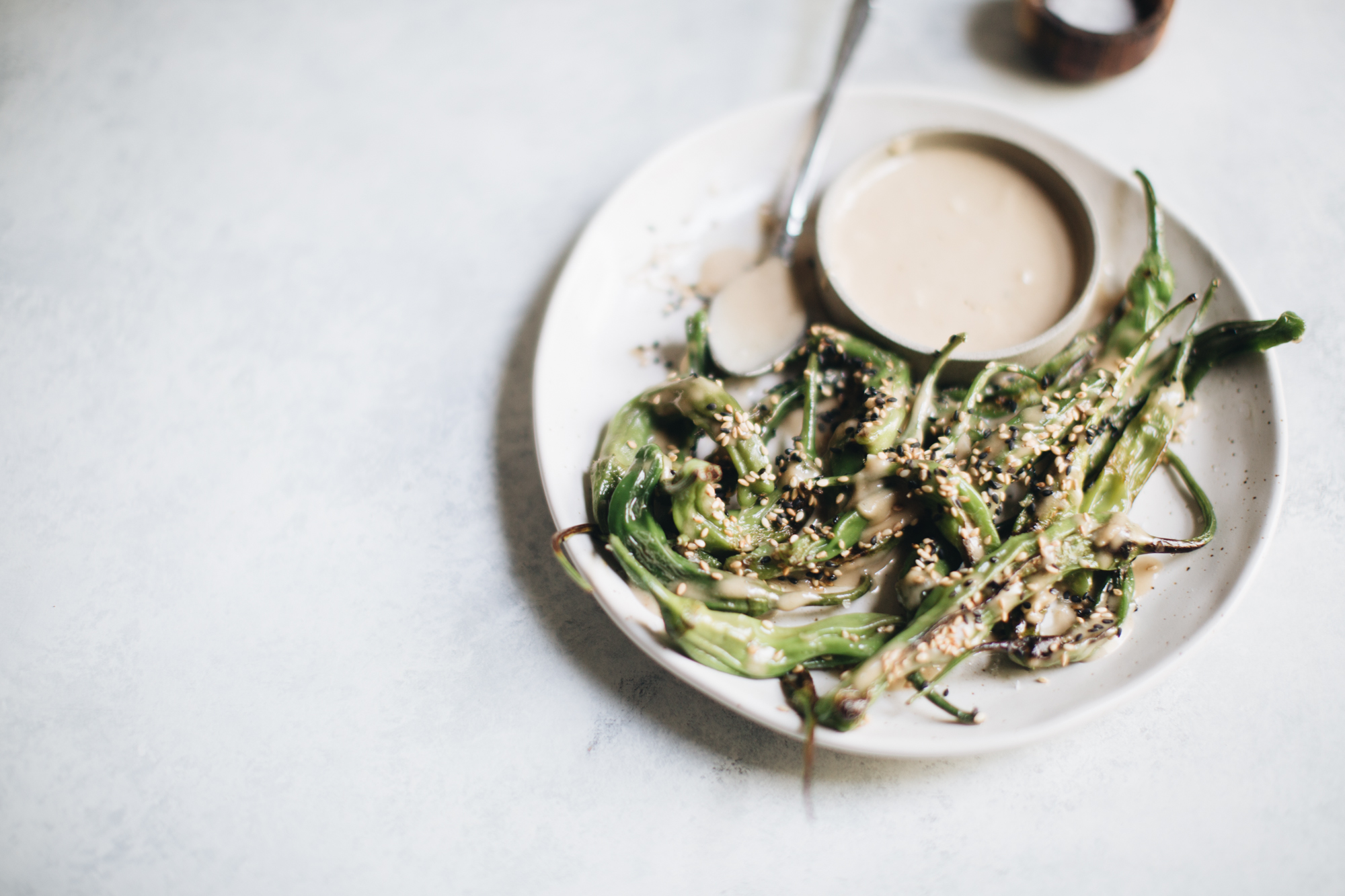 This sesame sauce is very adaptable. If you can't find shishitos, smother this sauce on green beans, sugar snap peas, asparagus, snow peas, eggplant or even noodles.
