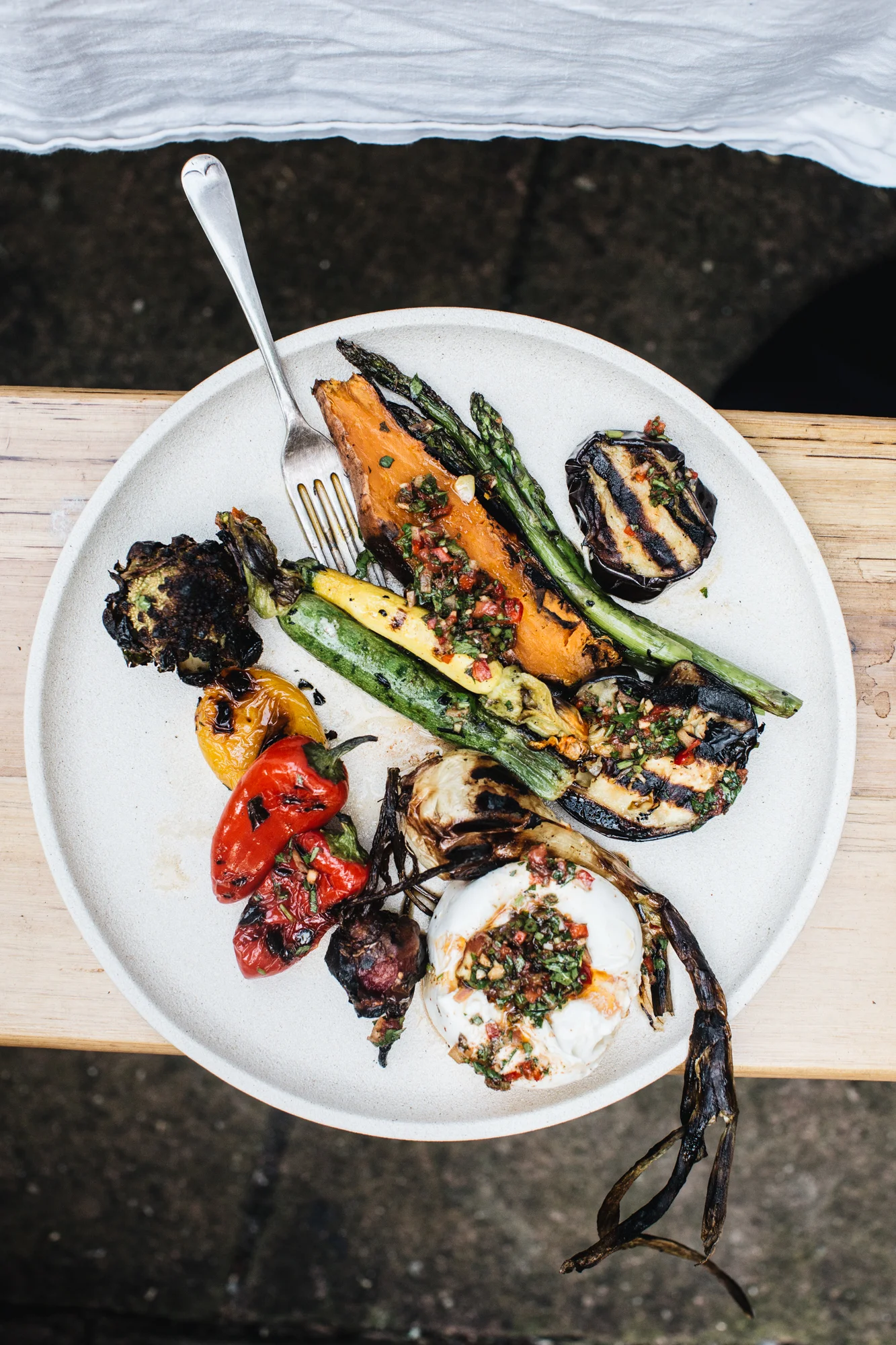For this recipe, use whatever vegetables are seasonal in your part of the world. I used asparagus, beets, sweet potato, corn, baby peppers, spring onions, zucchini with flowers, eggplant, kale and baby cauliflowers. Char the vegetables on high heat (a barbecue is best), add a ball or two of creamy burrata and smother in an Argentine chimichurri. Enjoy xx