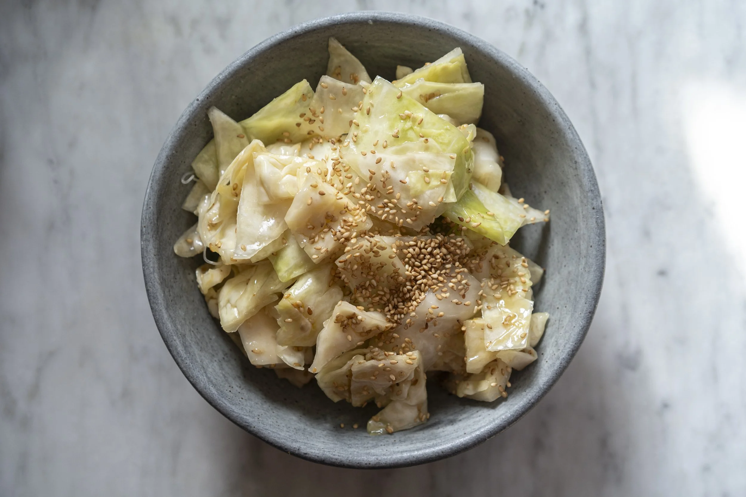 The name addictive cabbage is a translation from its origin dish yamitsuki; in Japanese, yamitsuki means addictive. It’s a humble dish, barely adorned yet impossible not to eat compulsively. Uncooked cabbage is massaged in salt to tenderize it slightly and then dressed in garlic, sesame oil and seeds.