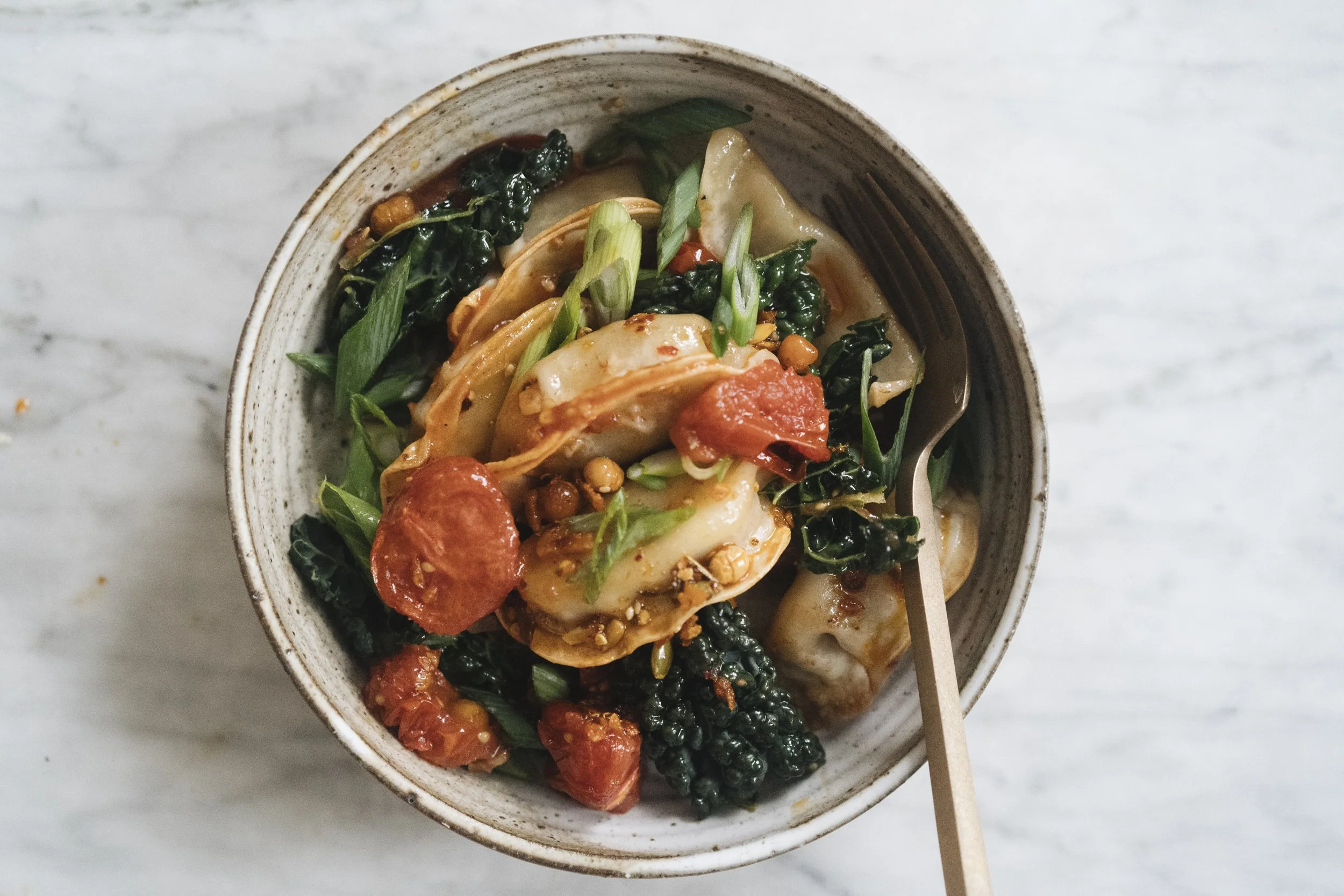 Remove the tomatoes and dumplings from the oven and immediately add the kale or spinach leaves and toss well to combine, allowing the residual heat to soften the leaves. Transfer to serving bowls and top with more chili crisp and scallions. Serve warm or at room temperature.