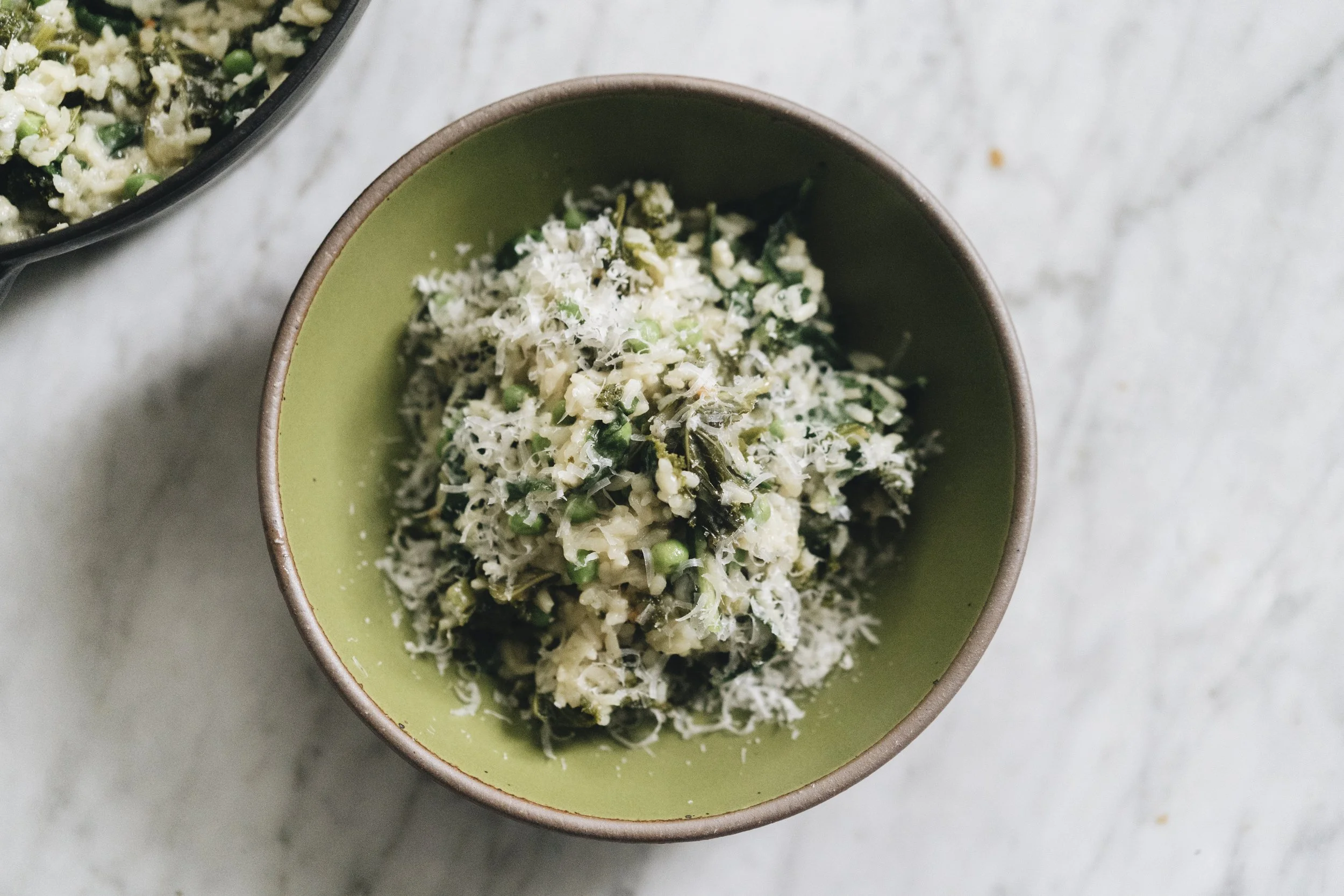 Recipe headnote by Kay Chun: This easy baked risotto eliminates the constant stirring required in traditional risotto recipes. It’s laden with vegetables, namely kale and spinach, but other leafy greens like Swiss chard or collard greens would work equally well. If you happen to have some extra asparagus, sub it in for the peas. This risotto makes a great starter or side dish, but you can also turn it into a vegetarian main course by using vegetable or mushroom stock in place of the chicken broth, and topping it with sautéed mushrooms, a fried egg or crispy tofu slices. Leftovers can be refrigerated for two days and reheated with more broth, or repurposed into crunchy rice cakes or arancini. Simply form into patties or balls,
