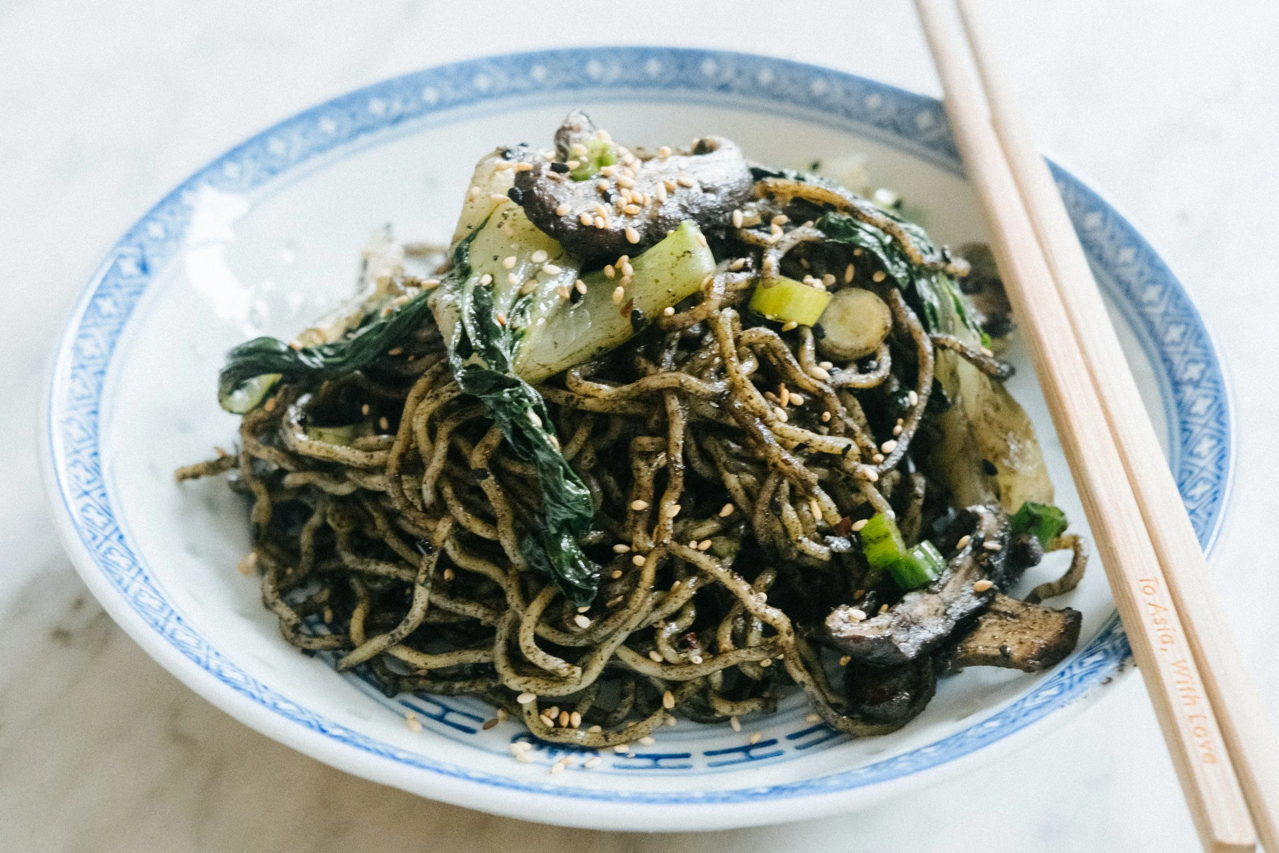 Heat a large wok or skillet (frying pan) on medium high heat for 2 minutes until very hot. Drizzle with 1-2 tablespoons of oil andadd the mushrooms, season with sea salt and pepper and leave to cook undisturbed for 30 seconds to allow them to get a slight char. Toss and cook, stirring occasionally, until the mushrooms have softened and are golden around the edges, about 2-3 minutes. Add the greens, season with sea salt and pepper and cook, stirring occasionally until just wilted but still bright green, another 2-3 minutes. Add the noodles to the pan, along with the black sesame sauce and toss thoroughly until well coated. Turn off the heat.