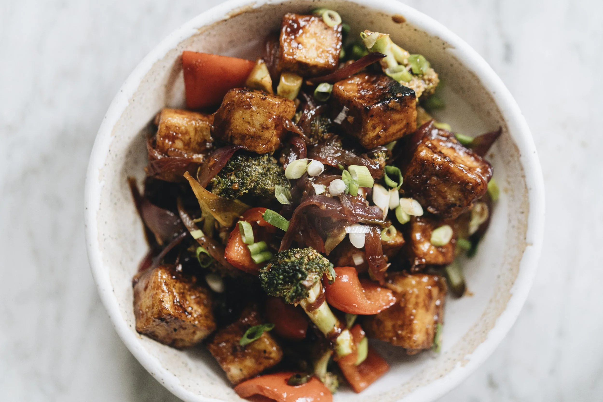 Place the pan back onto medium high heat. Add 1- 2 tablespoons of oil to the pan and add the ginger, garlic, and jalapeño and stir until fragrant, about 30 seconds. Add the capsicum (bell pepper), broccoli and onion, season with 1 teaspoon of salt and stir fry just until the vegetables are crisp tender (or to your liking), about 4-6 minutes. Add the sauce and toss briefly, about 20-30 seconds, until it has thickened up. Add the tofu and toss until it is coated in the sauce. Remove from heat immediately.