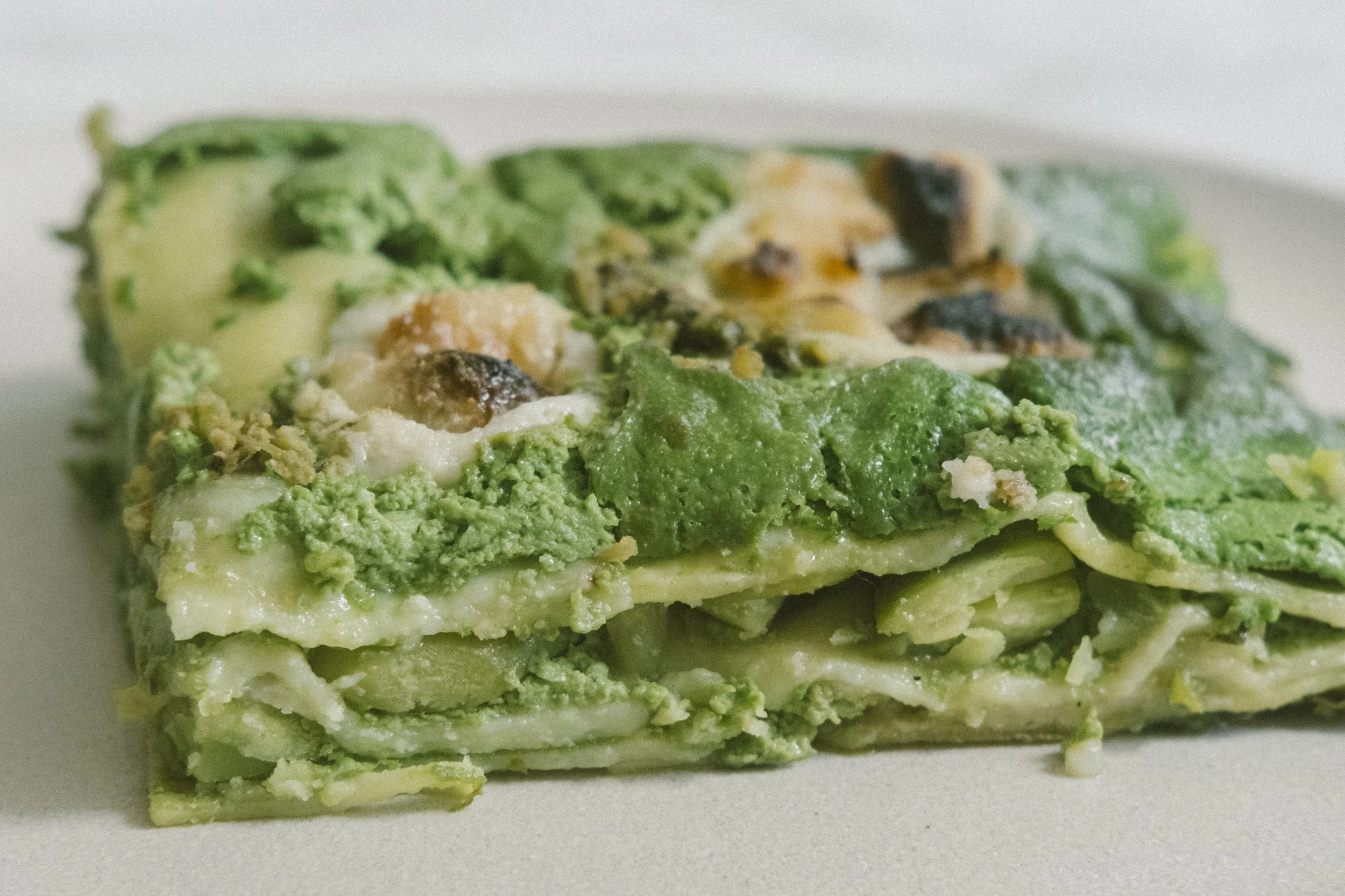 A verdant lasagna, creamy and vibrant. I wanted to create a very specific lasagna, one that is rich and luscious, yet still light. To achieve this, I called upon the tofu cream recipe from Tenderheart, which makes a velvety, fluffy sauce, without the need for actual cream or thickeners. The tofu does it all - it gives body, a whisper of sweetness, an airy texture. I’ve added a generous amount of baby spinach to the creamd tofu, which delivers a bright green hue and bolsters the vegetable content of this dish.