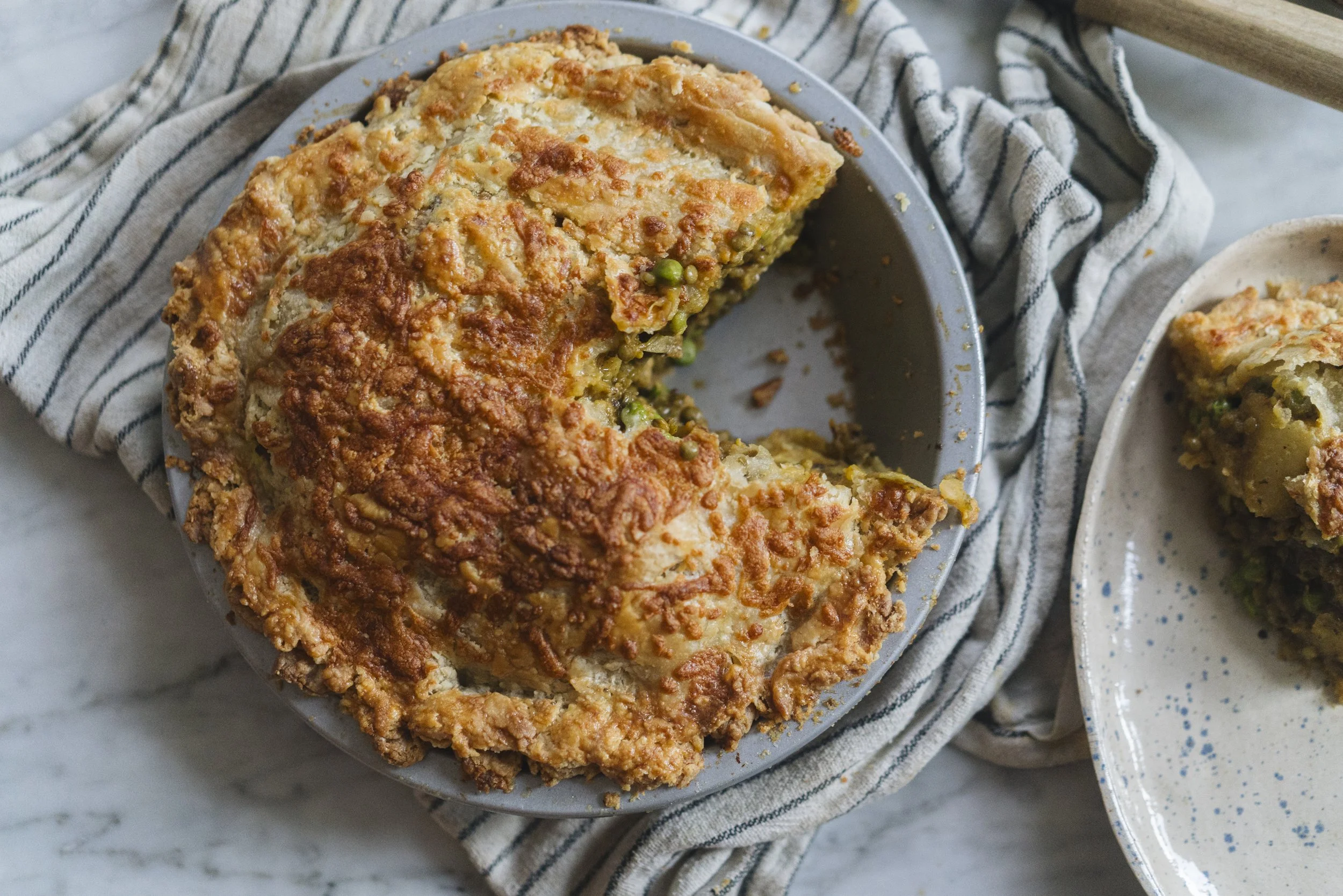Preheat the oven to 200˚C / 400˚F. Scatter half the cheese onto the base of the cooled pie crust. Add the filling, as much as will fit, allowing it to dome in the centre. Take half of your remaining cheese and scatter on top of the curry filling.