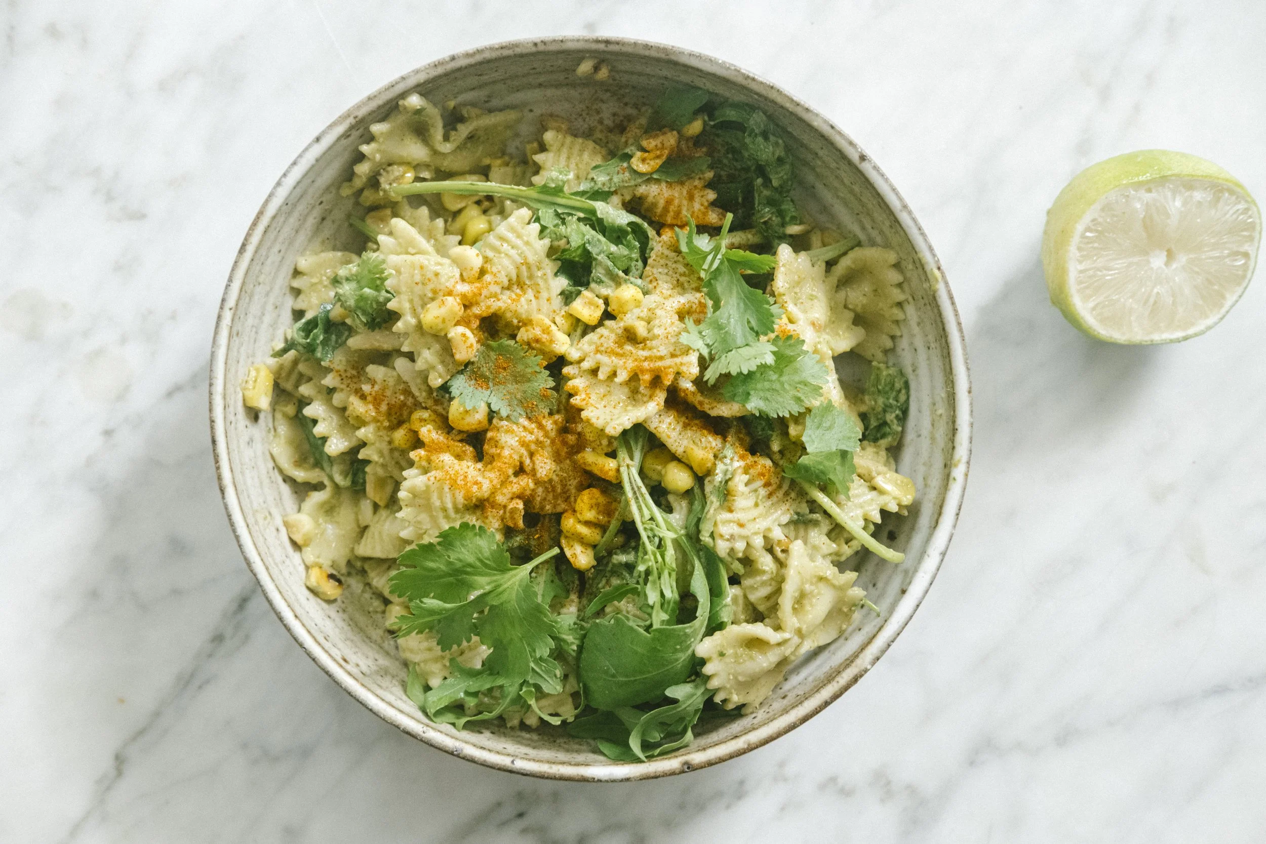 Mexican elote is a fairly perfect dish - charred corn, slathered with crema, and dusted in spices, finished with cheese and lime. I have combined the flavours of elote, and esquites, a Mexican street corn dish, and incorporated that into a pasta salad. For the creamy element, which is usually Mexican crema, I’ve opted for an avocado cream, accented with lime, jalapeno and coriander (cilantro).