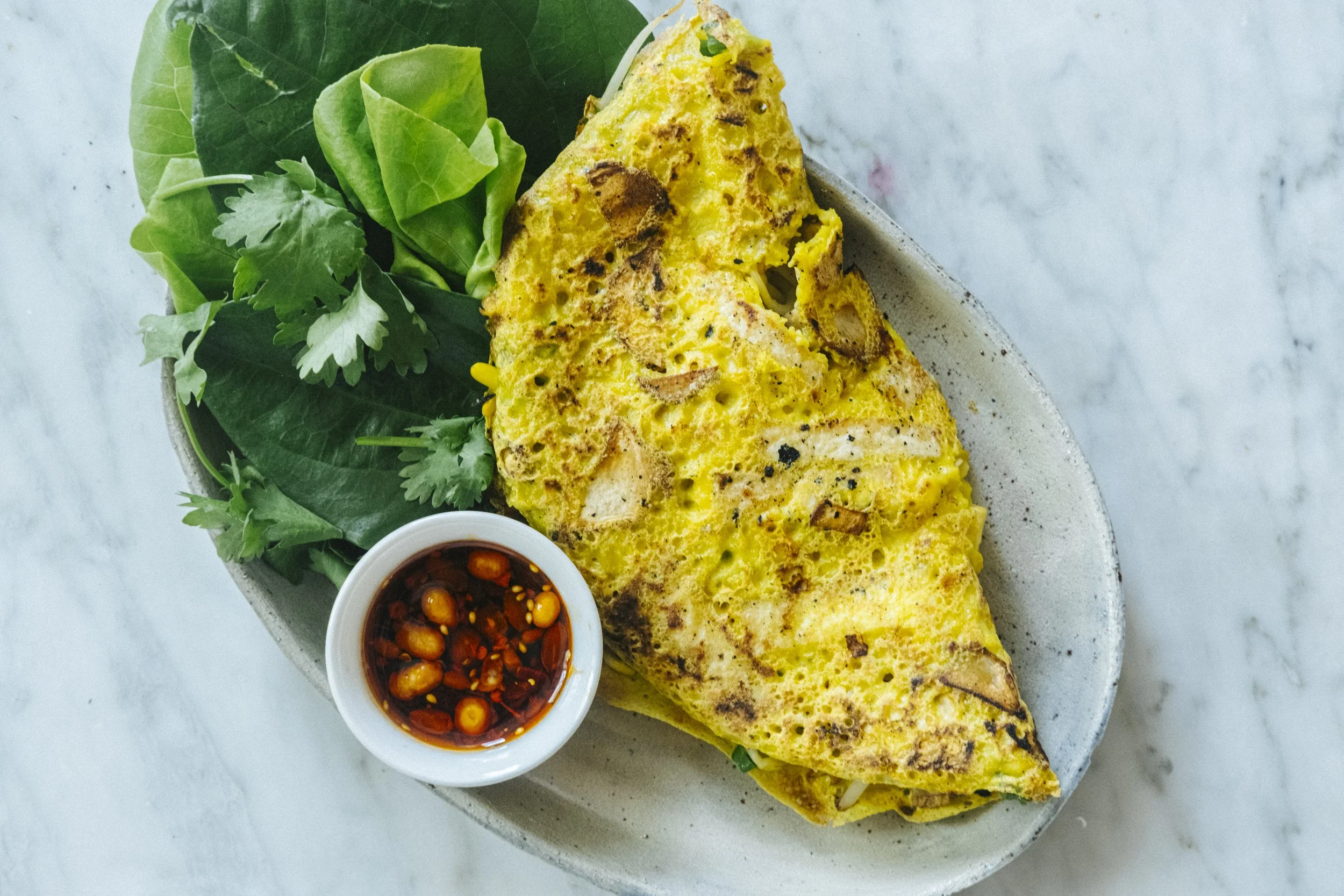 To eat, break a piece of crêpe onto a lettuce leaf, add the herbs and other optional greenery, roll it all up and dip it in the dipping sauce.