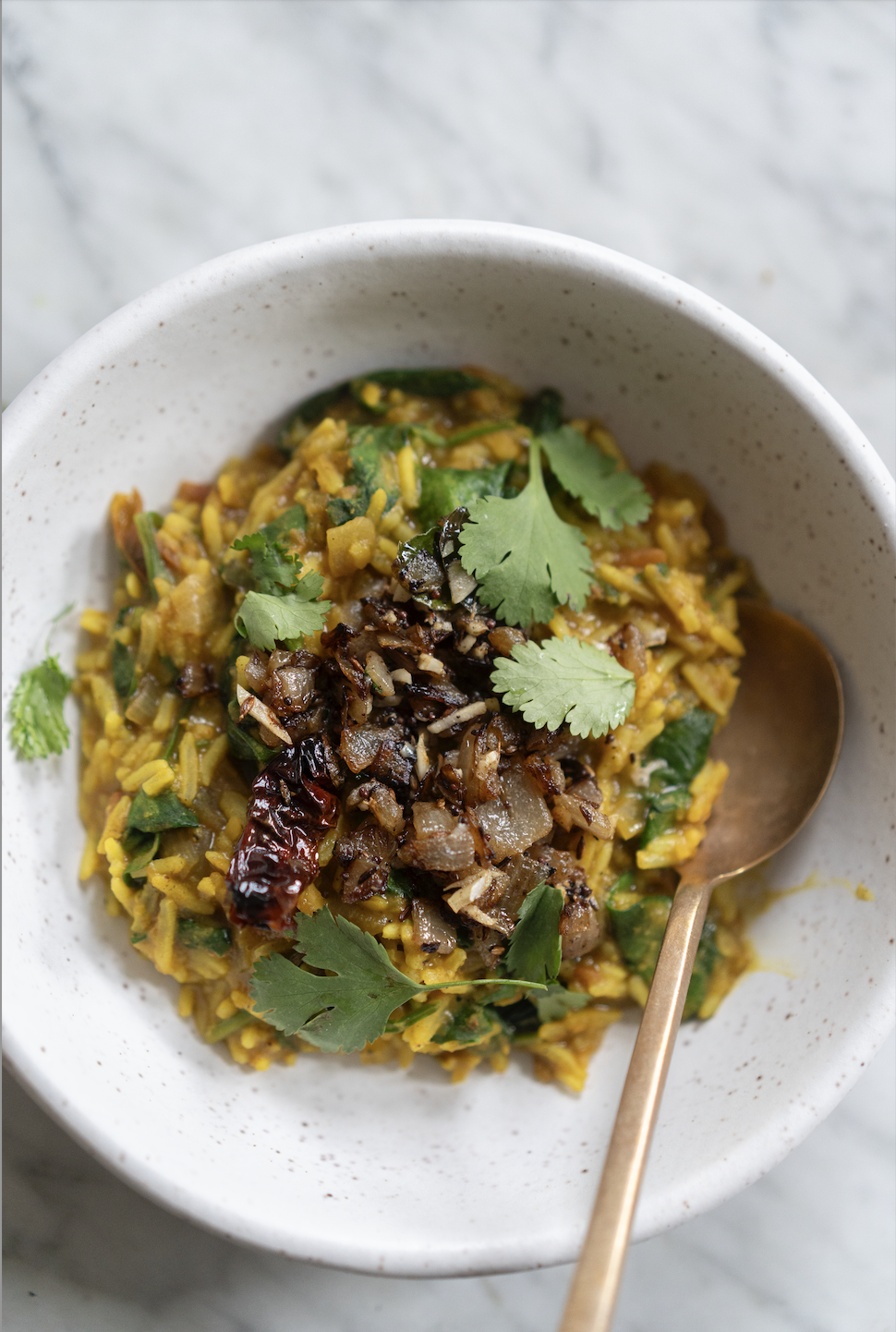 A gentle start to 2026, with a gently spiced, comforting textured rice, lentil and spinach dish. Pantry cooking at its most simple.